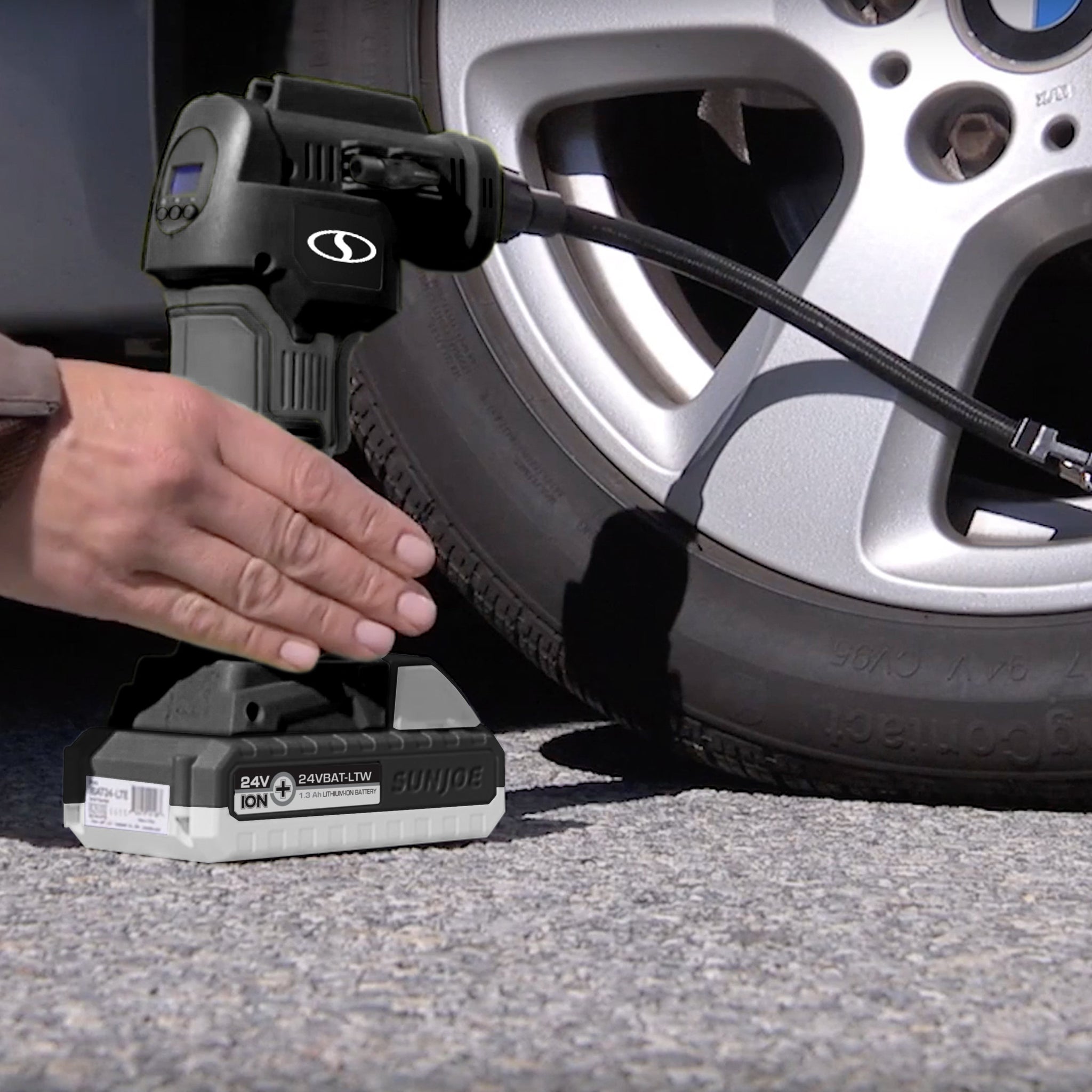 Skip the trip to the gas station and reach for the powerful portable air compressor that fits in the palm of your hand with the 24V-AJC-LTW 24-Volt Cordless Air Compressor from SUN JOE.