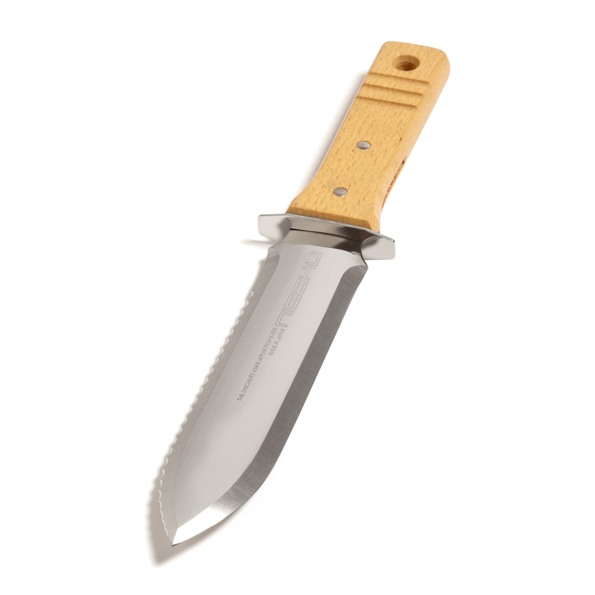 The Nisaku Japanese Stainless Steel Yamagatana Mokuetubatsuki boasts a serrated edge that's useful for dividing plants, planting bulbs, flowers and herbs, digging out weeds, removing rocks, cutting through roots and so much more! A comfortable wooden handle allows for a good grip for all-day digging, and ensures you push into the soil with more control. Comes with a faux leather sheath.