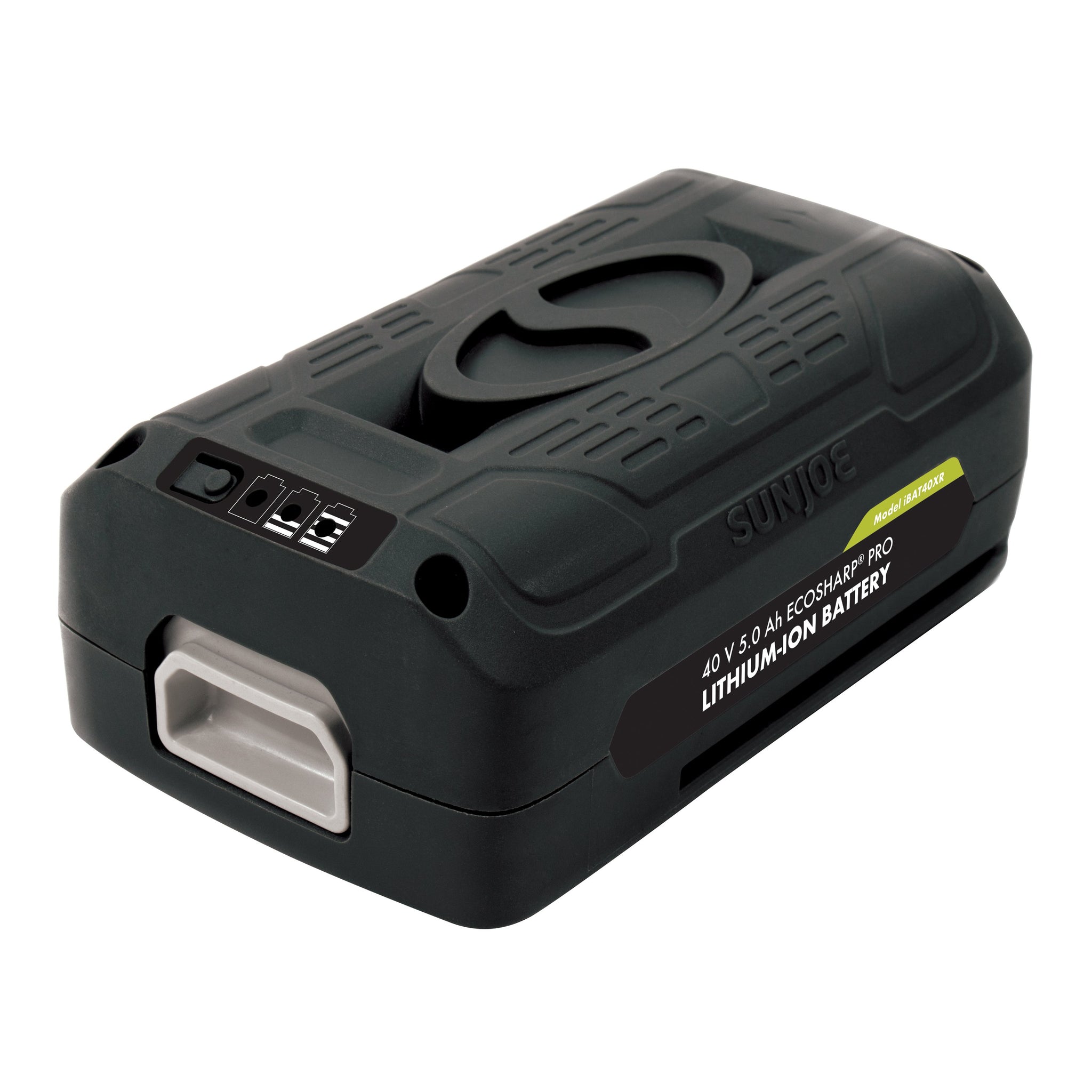 Power Up. Power your cordless iON tools the eco-friendly way with the 40-Volt EcoSharp® PRO iBAT40XR lithium-ion battery. Compatible with all Snow Joe® and Sun Joe® iON models, the iBAT40XR features high capacity 5.0 Ah lithium-ion cells that deliver no-fade power for maximum job performance. Simply insert the EcoSharp® PRO battery pack into your iON tool of choice and power up instantly without having to mess with gas, oil, pull-cords, or tangled extension cords! Breathe easily and confidently while working with your iBAT40XR since this Energy Star-rated battery pack provides for cleaner, emission-free air during operation. Although run-times will vary depending on the tool used and the job performed, up to 65 minutes of whisper-quiet operation is a good approximation of what to expect from your iBAT40XR-powered tool. The fuel gauge indicator lights on the EcoSharp® PRO will also let you easily monitor your battery’s charge capacity while it is in use. When it is time to charge, simply slide the iBAT40XR into its dedicated iCHRG40 charger. Just like your cell-phone battery, the iBAT40XR has no memory effect, so there is no need to drain the battery or wait for full charge before use. The iBAT40XR holds its charge well in storage and will retain up to 65% charge for six months. Easy, convenient, reliable, and super-lightweight (only 2.6 lbs!), the 40-Volt EcoSharp® PRO iBAT40XR is the smart way to battery pack for your power trip.
