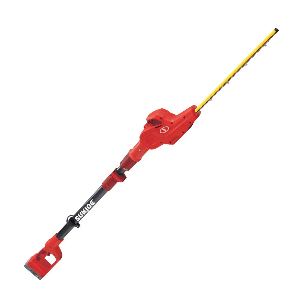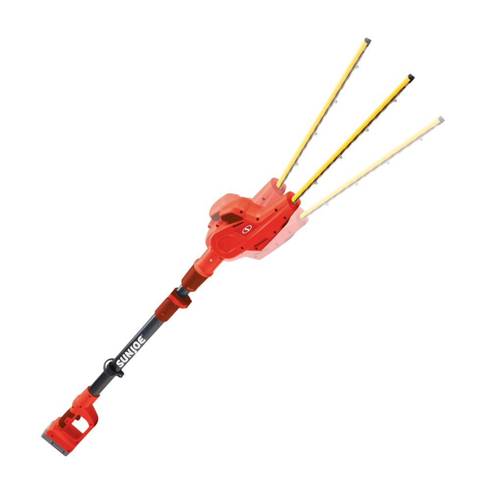 SUN JOE's multi-angle pivoting head allows for precise trimming of most tall bushes and hedges. 20ViONLT-PHT17-RED's 17-inch dual action, rust-resistant steel blades cut efficiently in both directions, and the telescoping pole adjusts from 6 ft to 7.9 feet for up to 12.5 feet of overhead reach. And when you’re ready to go low, simply pivot the head and point the pole down to work beneath the bushes.