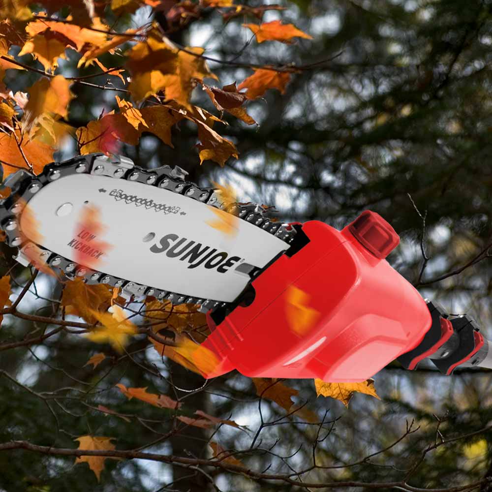 A CUT ABOVE THE REST. The Sun Joe 20ViONLT-PS8-RED cordless pole chain saw makes it quick and easy to trim your overgrown trees. Powered by the same interchangeable 20 V 2.5 Ah EcoSharp battery utilized by the other tools in the 20ViON series, the 20ViONLT-PS8-RED provides the cutting performance of a comparable electric-powered unit with the convenience and freedom of a lightweight (only 9.25 lbs!) cordless device.