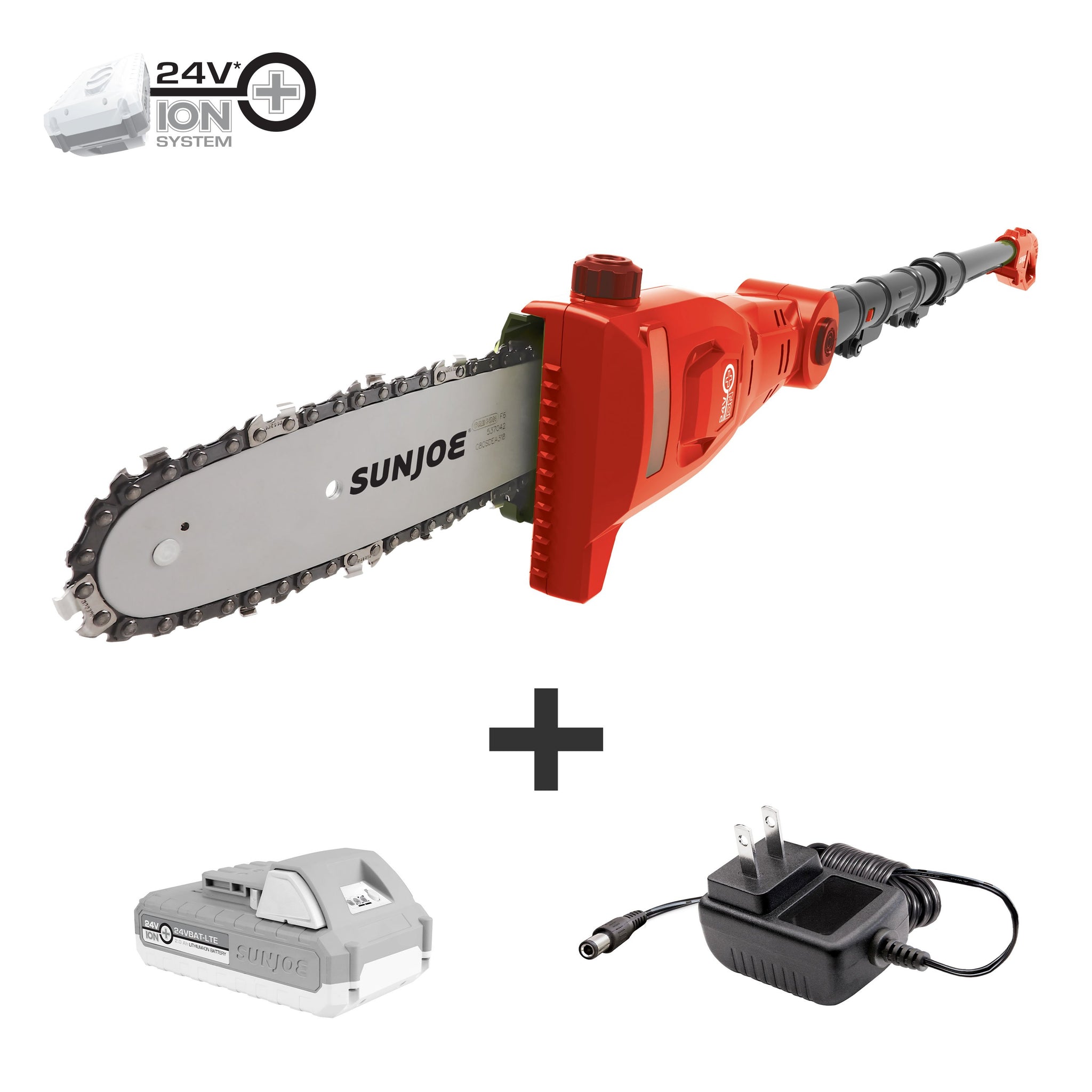 SEE IT? SAW IT — WITH SUN JOE! Cut your tree trimming tasks down to size and tackle those tough-to-reach branches with ease with the 24V-PS8-LTE 24-Volt 8-Inch Cordless Pole Chain Saw from SUN JOE. Powered by SUN JOE’s exclusive 24-Volt iON+ Battery System, 24V-PS8-LTE’s 2.0 Ah lithium-ion rechargeable battery offers up to 40 minutes of runtime and charges up in just 80 minutes. iON+ offers the all of the power and performance of gas with the best of cordless convenience for all your outdoor chores — and no emissions, fumes, fuss, or tangled extension cords.
