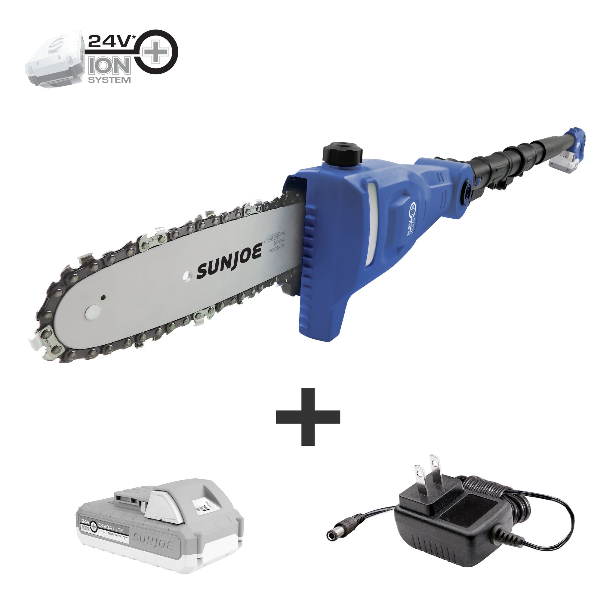 SEE IT? SAW IT — WITH SUN JOE! Cut your tree trimming tasks down to size and tackle those tough-to-reach branches with ease with the 24V-PS8-LTE 24-Volt 8-Inch Cordless Pole Chain Saw from SUN JOE. Powered by SUN JOE’s exclusive 24-Volt iON+ Battery System, 24V-PS8-LTE’s 2.0 Ah lithium-ion rechargeable battery offers up to 40 minutes of runtime and charges up in just 80 minutes. iON+ offers the all of the power and performance of gas with the best of cordless convenience for all your outdoor chores — and no emissions, fumes, fuss, or tangled extension cords.