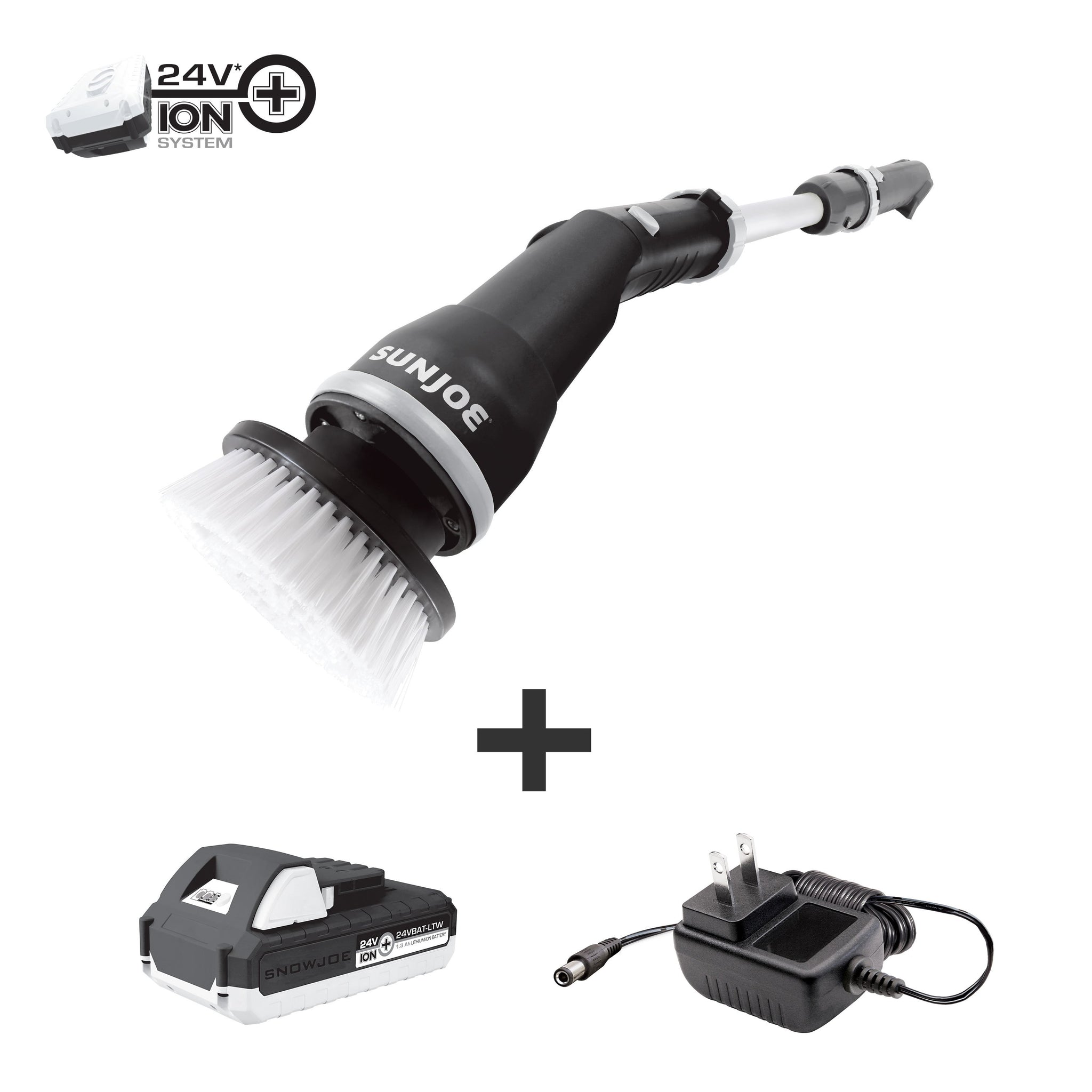 CLEAN HIGH SCRUB LOW WITH JOE! Take the tiring, tedious, repetitive work out of your cleaning to-do list with the 24V-PWSCRB-LTW-BLK 24-Volt Cordless Power Scrubber from SUN JOE! No more endless scrubbing by hand – tackle the toughest messes, mold and mildew, stains and more at home or on-the-go with cordless convenience. Perfect anywhere power is at a premium, like the laundromat, garage, pool or patio, SUN JOE’s power scrubbing dynamo also makes light work of household grime in the kitchen, laundry room or bathroom. Simply select from the four included, easy to clean, scrubbing brush heads to suit the task. The rotating head spins at two variable speeds — LOW (600 rpm) and HIGH (1000 rpm) — for light- to heavy-duty cleaning tasks. Effortlessly clean large surfaces in less time with the round brush or large flat brush head; Or, get in grout lines and corners with the cone brush and small flat brush. And SUN JOE doesn’t stop there! Go beyond the kitchen and bathroom with iON+ power — the rechargeable lithium-ion battery system with a world of possibilities. Clean the car, tires hub caps, scrub gunk off of the grill, wash the windows, get grime off of grout and granite, and so much more, with up to 50 minutes of continuous runtime! Reach high or low without bending! SUN JOE extends from 27 in. to 50 in. with the included pole attachment to get to from those hard-to-reach corners of your shower and tub without the pain and strain on your back and knees. And when the job is done, simply remove the extension pole for compact, convenient storage in the closet or cabinet. Clean the whole house — from top to bottom and corner to corner — with SUN JOE®! GET EQUIPPED®.