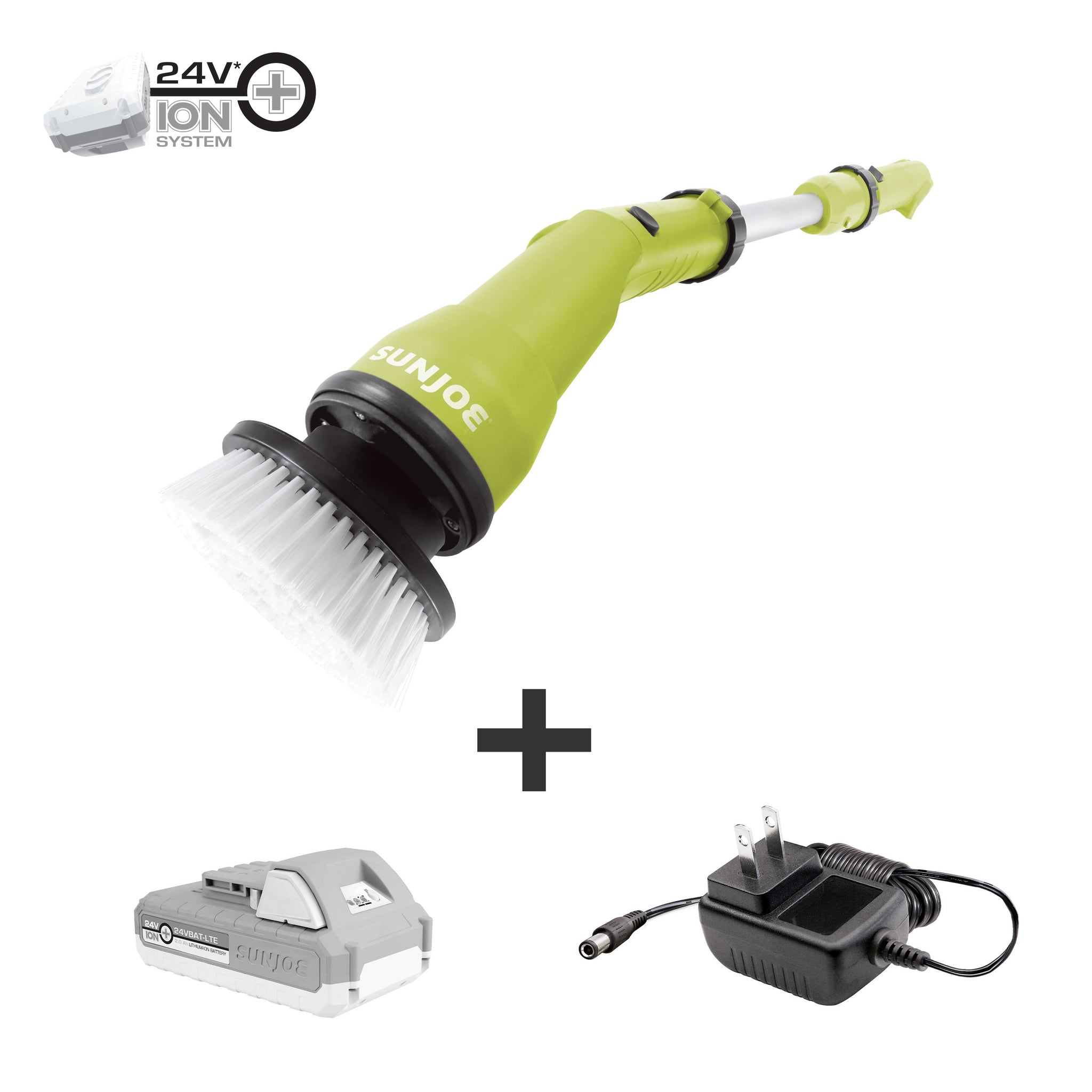 CLEAN HIGH SCRUB LOW WITH JOE! Take the tiring, tedious, repetitive work out of your cleaning to-do list with the 24V-PWSCRB-SK1 24-Volt Cordless Power Scrubber from SUN JOE! No more endless scrubbing by hand – tackle the toughest messes, mold and mildew, stains and more at home or on-the-go with cordless convenience. Perfect anywhere power is at a premium, like the laundromat, garage, pool or patio, SUN JOE’s power scrubbing dynamo also makes light work of household grime in the kitchen, laundry room or bathroom. Simply select from the four included, easy to clean, scrubbing brush heads to suit the task. The rotating head spins at two variable speeds — LOW (600 rpm) and HIGH (1000 rpm) — for light- to heavy-duty cleaning tasks. Effortlessly clean large surfaces in less time with the round brush or large flat brush head; Or, get in grout lines and corners with the cone brush and small flat brush. And SUN JOE doesn’t stop there! Go beyond the kitchen and bathroom with iON+ power — the rechargeable lithium-ion battery system with a world of possibilities. Clean the car, tires hub caps, scrub gunk off of the grill, wash the windows, get grime off of grout and granite, and so much more! Reach high or low without bending! SUN JOE extends from 27 in. to 50 in. with the included pole attachment to get to from those hard-to-reach corners of your shower and tub without the pain and strain on your back and knees. And when the job is done, simply remove the extension pole for compact, convenient storage in the closet or cabinet. Clean the whole house — from top to bottom and corner to corner — with SUN JOE®! GET EQUIPPED®.
