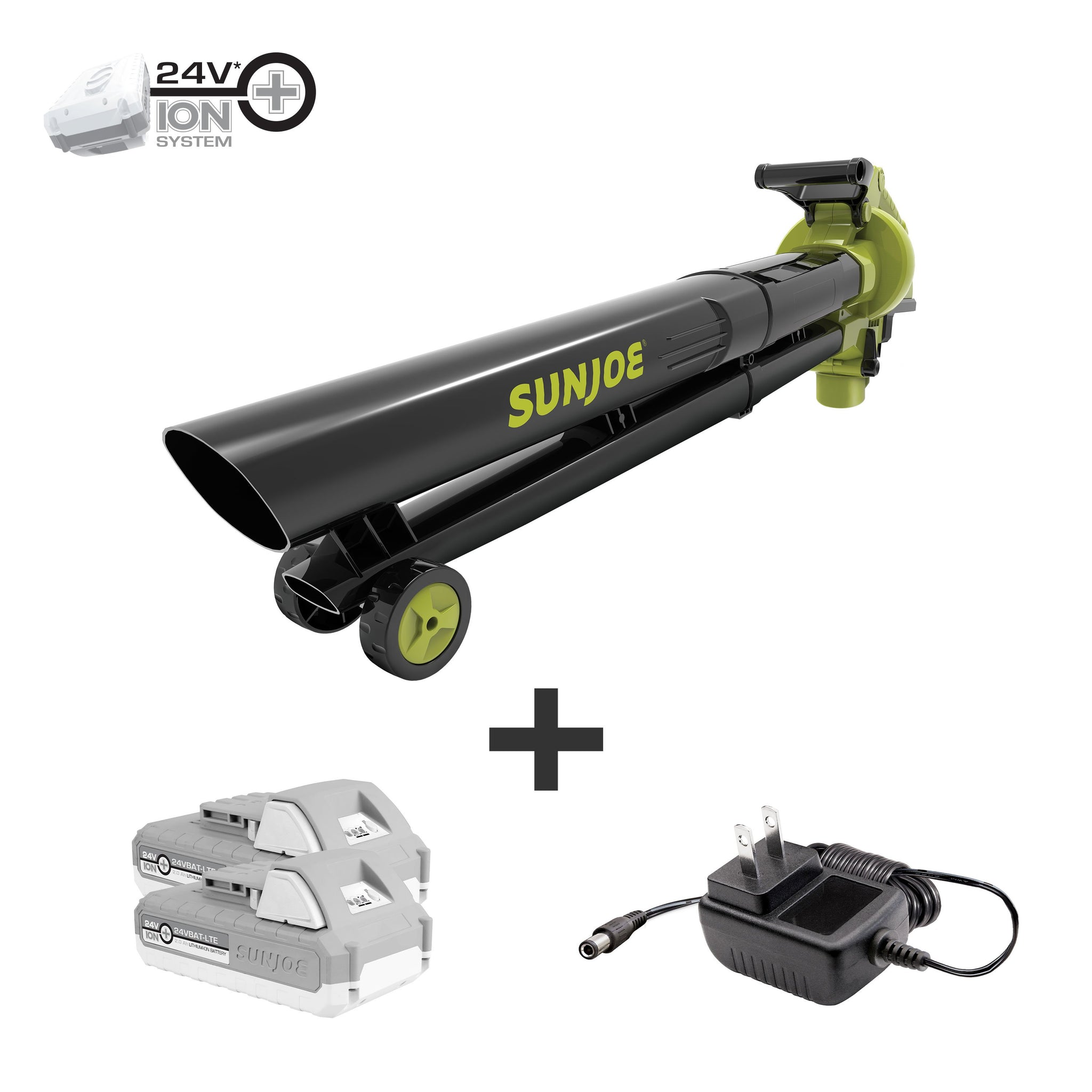 BREEZE THROUGH YOUR CHORES! Meet the next generation in lawn and leaf-clearing tech in the legendary line-up of 24V iON+ yard + garden tools — the revolutionary 48-Volt Cordless Blower/Vac/Mulcher: 24V-X2-BVM143-LTE from Sun Joe! Lightweight, sleek and powerful, the eco-friendly, cordless blower uses two (included) 24-Volt iON+ lithium-ion batteries for up to 48-Volts of leaf-clearing power! Cut The Cord® and go beyond the porch and patio with the revolution of Power To Go! Sun Joe’s long-life Lithium-ion batteries provide up to 65 minutes of cord-free, gas-free, rechargeable runtime on a single charge. Pack the power of a hurricane in the palm of your hand with up to 155 MPH max wind speed, for quick clean-ups anywhere power is at a premium. Choose from 5 variable speed settings to suit the sweeping task and rid your yard of leaves, grass trimmings, dirt + debris. Switching from blower to vacuum/mulcher is as easy as a twist of the knob to go from blower mode to vacuum mode. Turn your leaves and yard waste into nutrient-rich mulch with up to 388 CFM of vacuum air flow and an 8:1 reduction ratio! And when the work is done, simply plug-in and power-up the 24V iON+ batteries so it’s recharged and ready for your next project.