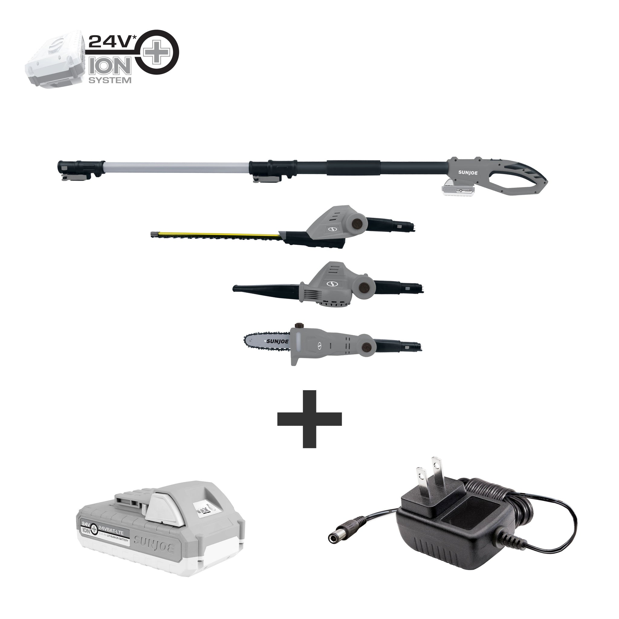 • Load image into Gallery viewer, Sun Joe GTS4001C-BLK 24-Volt iON+ Cordless Lawn Care System Kit | Hedge Trimmer | Pole Saw | Leaf Blower | W/ 2.0-Ah Battery and Charger (Black)