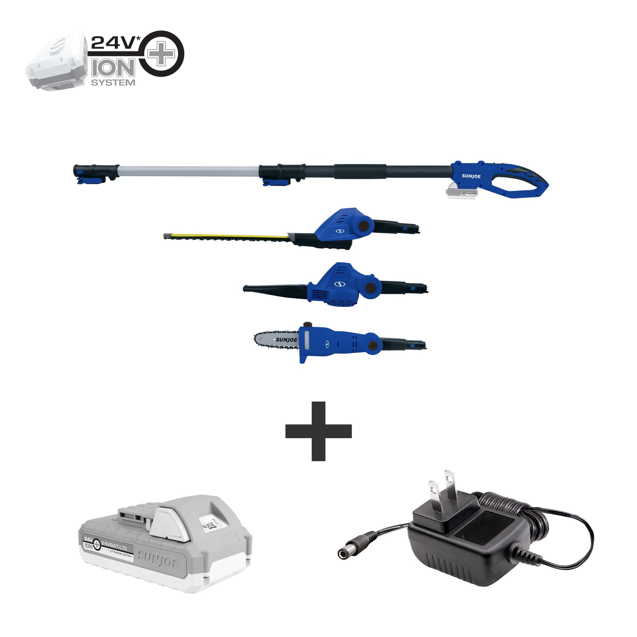 • Load image into Gallery viewer, Sun Joe GTS4001C-SJB 24-Volt iON+ Cordless Lawn Care System Kit | Hedge Trimmer | Pole Saw | Leaf Blower | W/ 2.0-Ah Battery and Charger (Blue)
