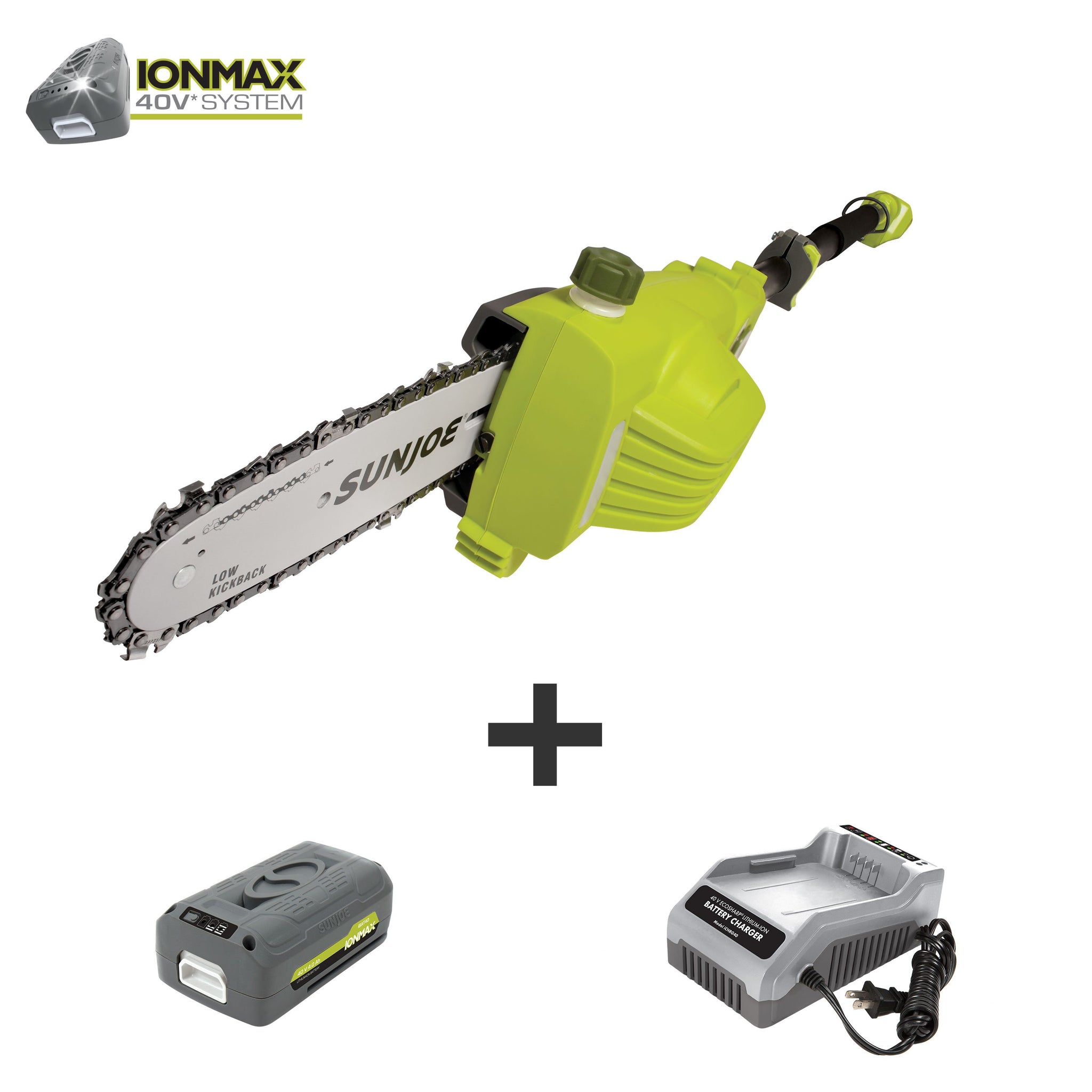 A CUT ABOVE THE REST. The Sun Joe® iON8PS2 cordless pole chain saw makes it quick and easy to trim your overgrown trees. Powered by the same interchangeable 40 V EcoSharp® battery utilized by the other tools in the iON series, the iON8PS2 provides the cutting performance of a comparable gas- or electric-powered unit with the convenience and freedom of a lightweight (only 8.6 lbs!) cordless device. Operation is simple: