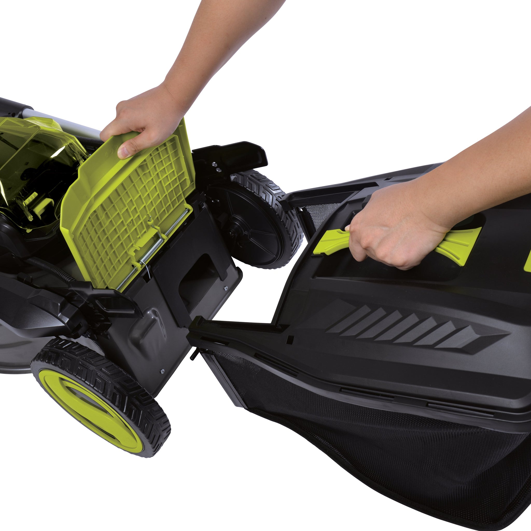 Customize your cutting height with iON’s 7-position manual height-adjustment lever — choose from 1.2", 1.57", 1.97", 2.36", 2.76", 3.35", and 3.75" for the perfect, precise cut tailored to your yard. SUN JOE’s included 13.2 gallon grass-collection bag makes disposing of lawn clippings quick and easy. Or switch in the included discharge chute to put the nutrient-rich trimmings back into your lawn! And when the work is done, simply fold down iON’s telescopic, collapsible handle for compact, convenient storage.