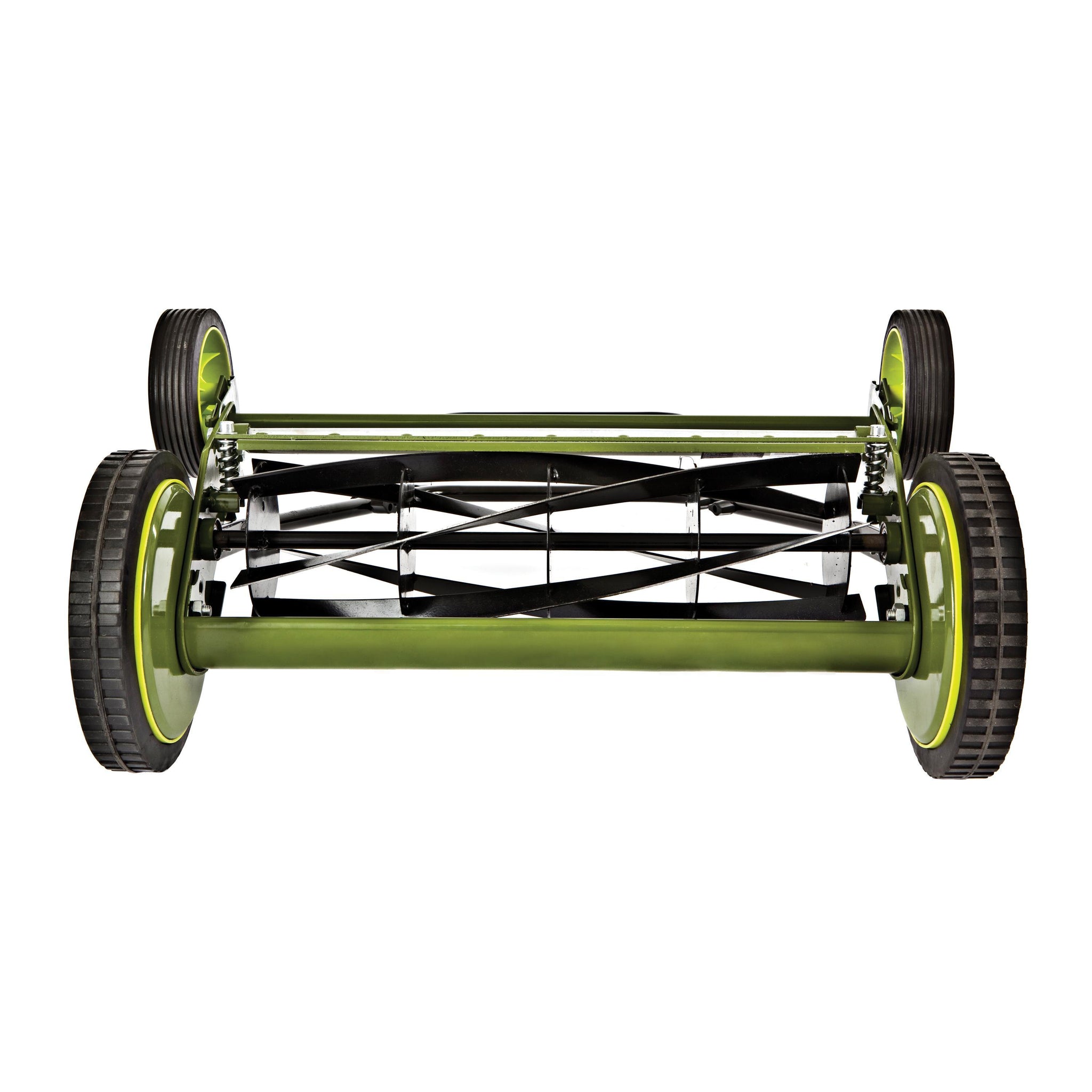 SEE JOE MOW. No messy gas; just an easy-to-use, lightweight, maneuverable and economical push reel mower. The Sun Joe MJ501M-RM Reel Mower with Grass Catcher handles tough turf with ease and provides a quiet, eco-friendly solution for any lawn. The MJ501M-RM comes with a handy rear collection bag to help keep your yard nice and tidy. Powered by you, the Mow Joe MJ501M-RM has an 18-inch wide cutting path and a 9 position height adjustment lever. Tailor cutting heights up to 2.44-inch so you are in complete control of your grass The mower’s dual wheel design and sharp harden steel blades ensures accuracy and cutting efficiency.